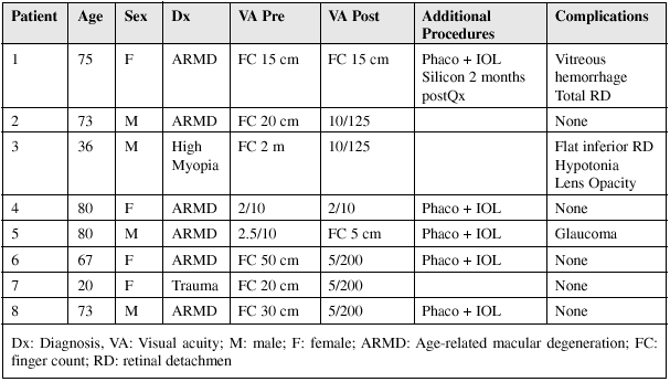 Complications included one vitreous hemorrhage with total retinal detachment,